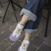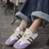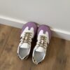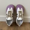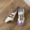 Przód buta wykonano z miękkiego lawendowego weluru, który nadaje całości lekkości i świeżości. Boki uszyto z jasnej, naturalnej skóry o delikatnej strukturze, dzięki czemu model zachowuje sportowy, ale dopracowany charakter. Panterkowe paski na bokach oraz wstawka na pięcie przyciągają uwagę i nadają butom wyrazistości, podkreślając ich nowoczesny styl.