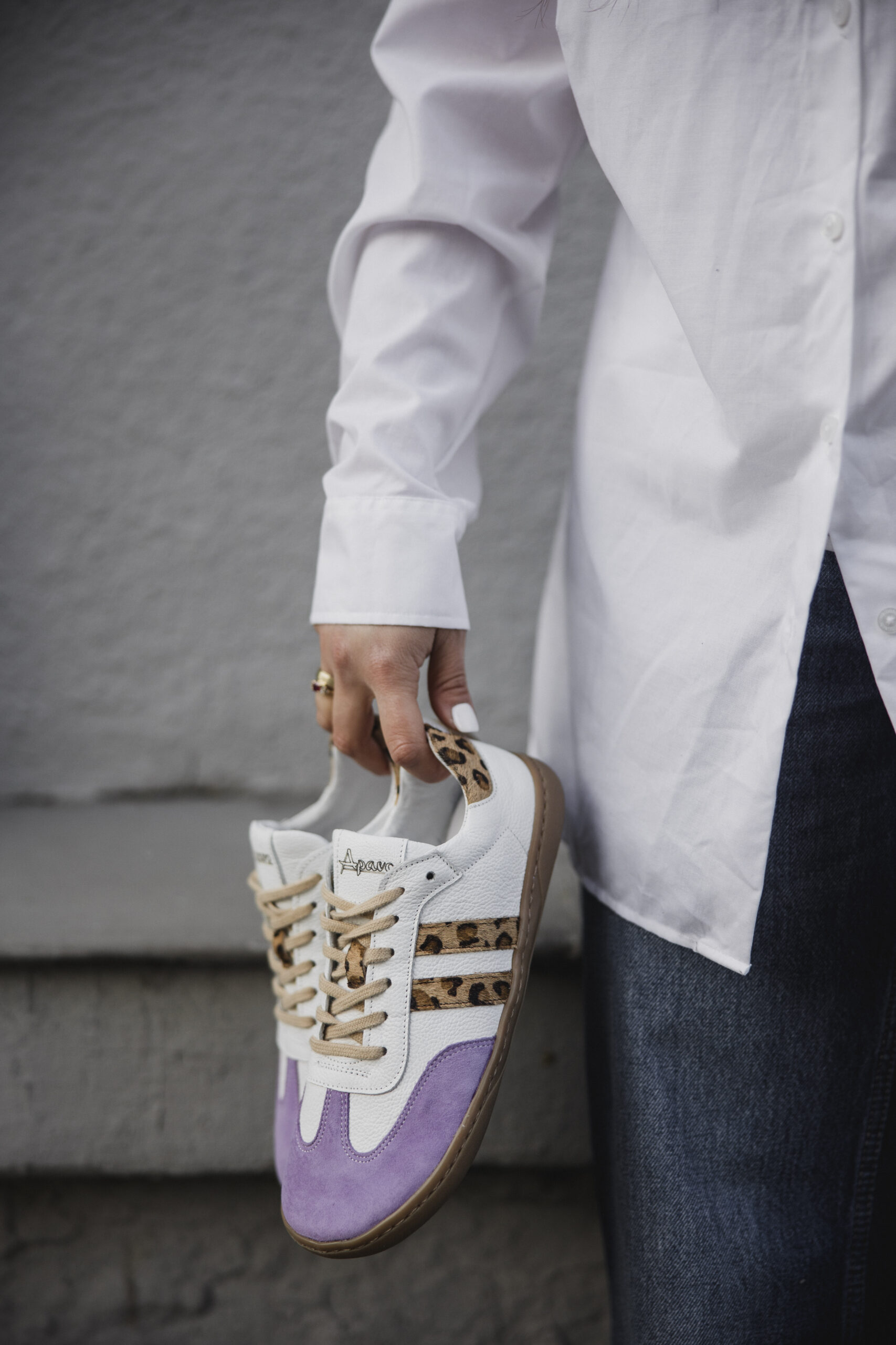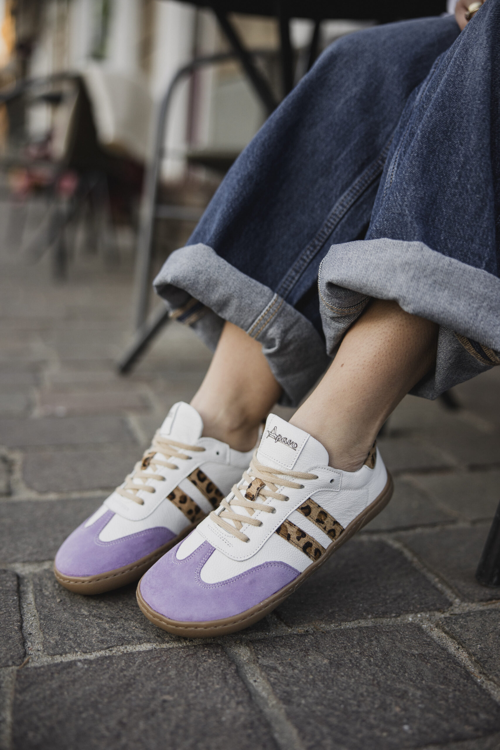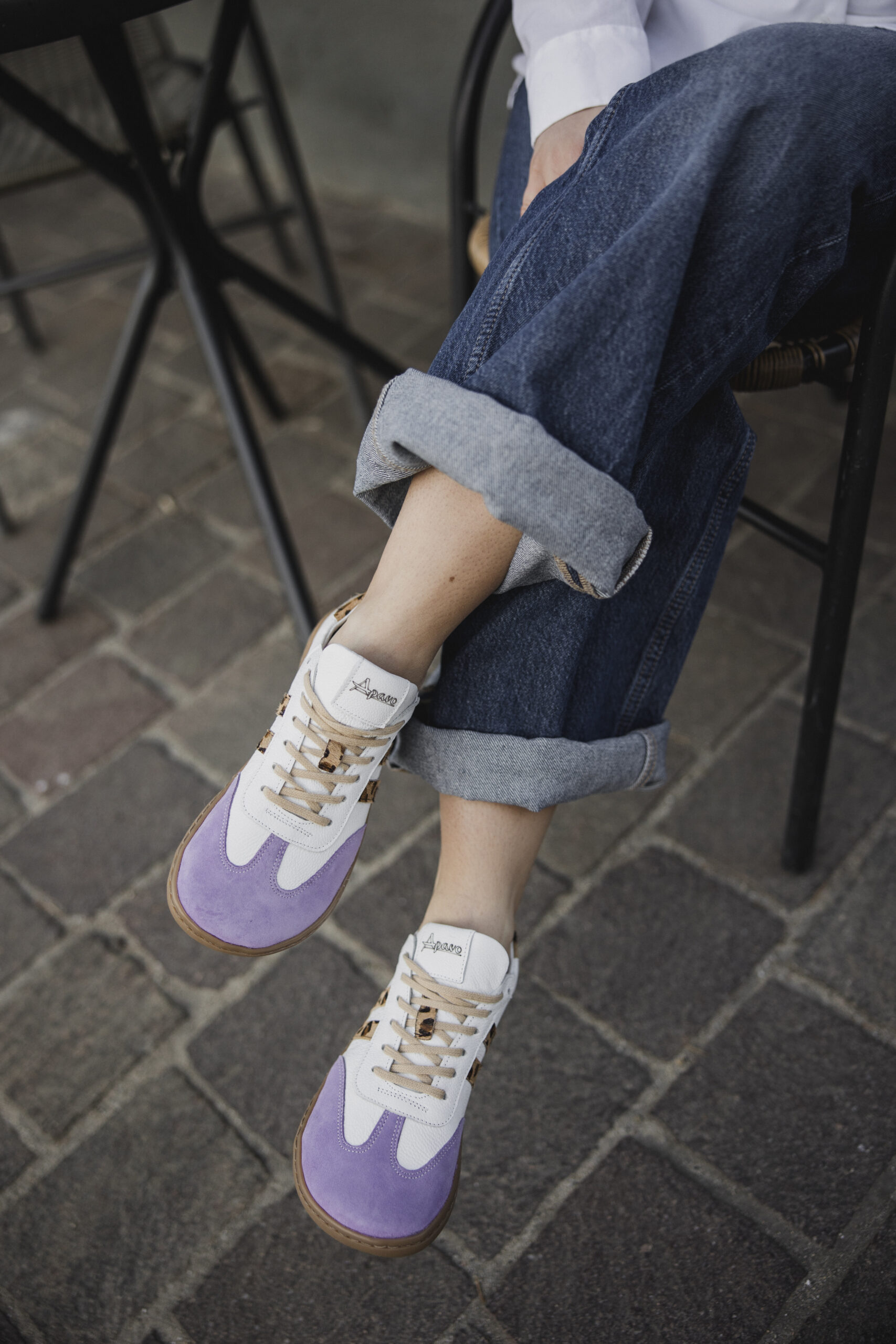 Półbuty barefoot damskie Callie – lawenda z panterką to sportowe sneakersy barefoot o wyrazistym charakterze. Połączenie lawendowego weluru, białej skóry i panterkowego akcentu tworzy nowoczesny model do codziennych stylizacji, z zachowaniem pełnej swobody ruchu stopy.