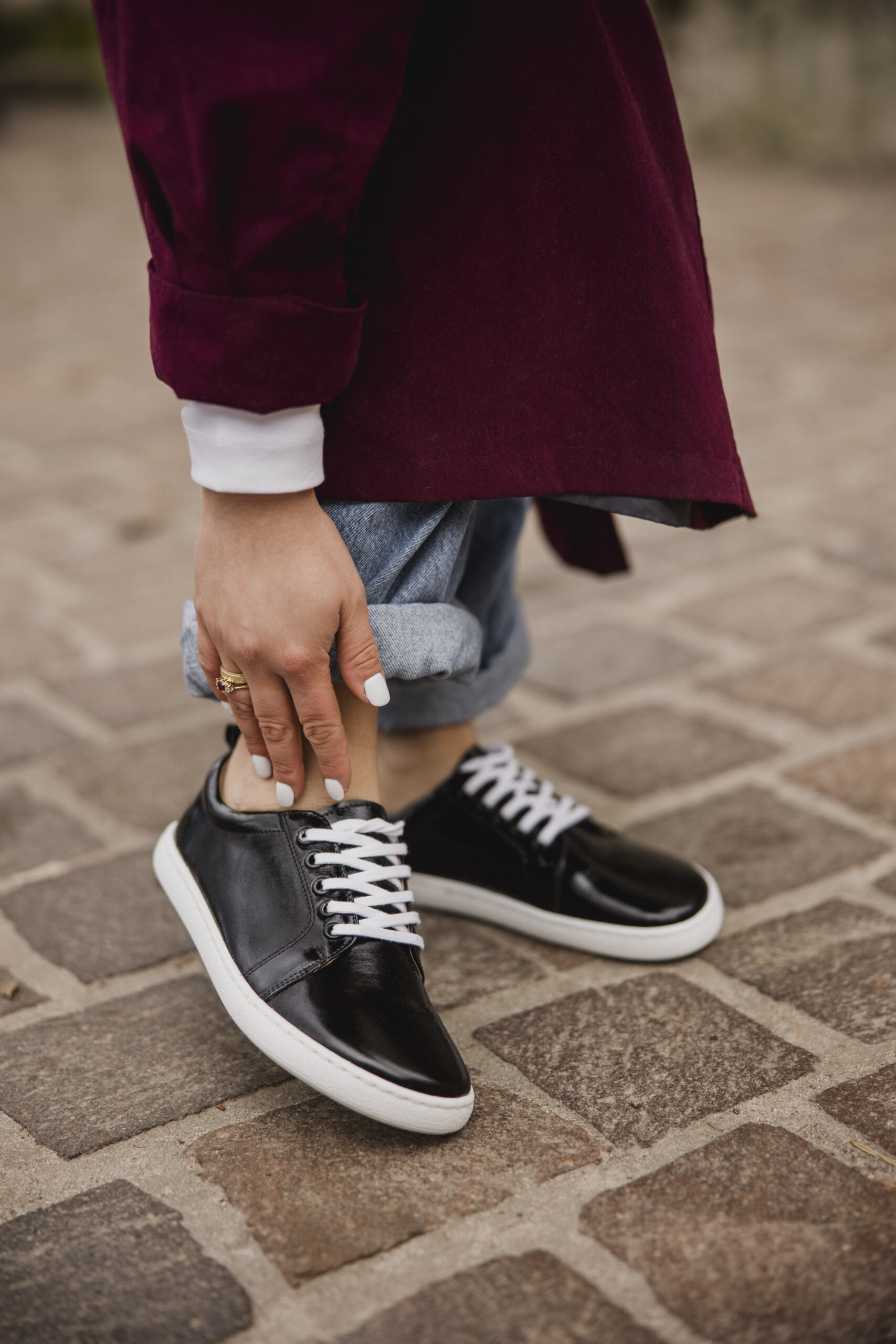 Półbuty barefoot damskie Lena to eleganckie sneakersy wykonane z czarnej skóry lakierowanej, która nadaje im wyjątkowego charakteru i subtelnego połysku. Kontrastowa biała podeszwa oraz jasne sznurówki przełamują elegancję lakieru, tworząc nowoczesny i bardzo stylowy model.