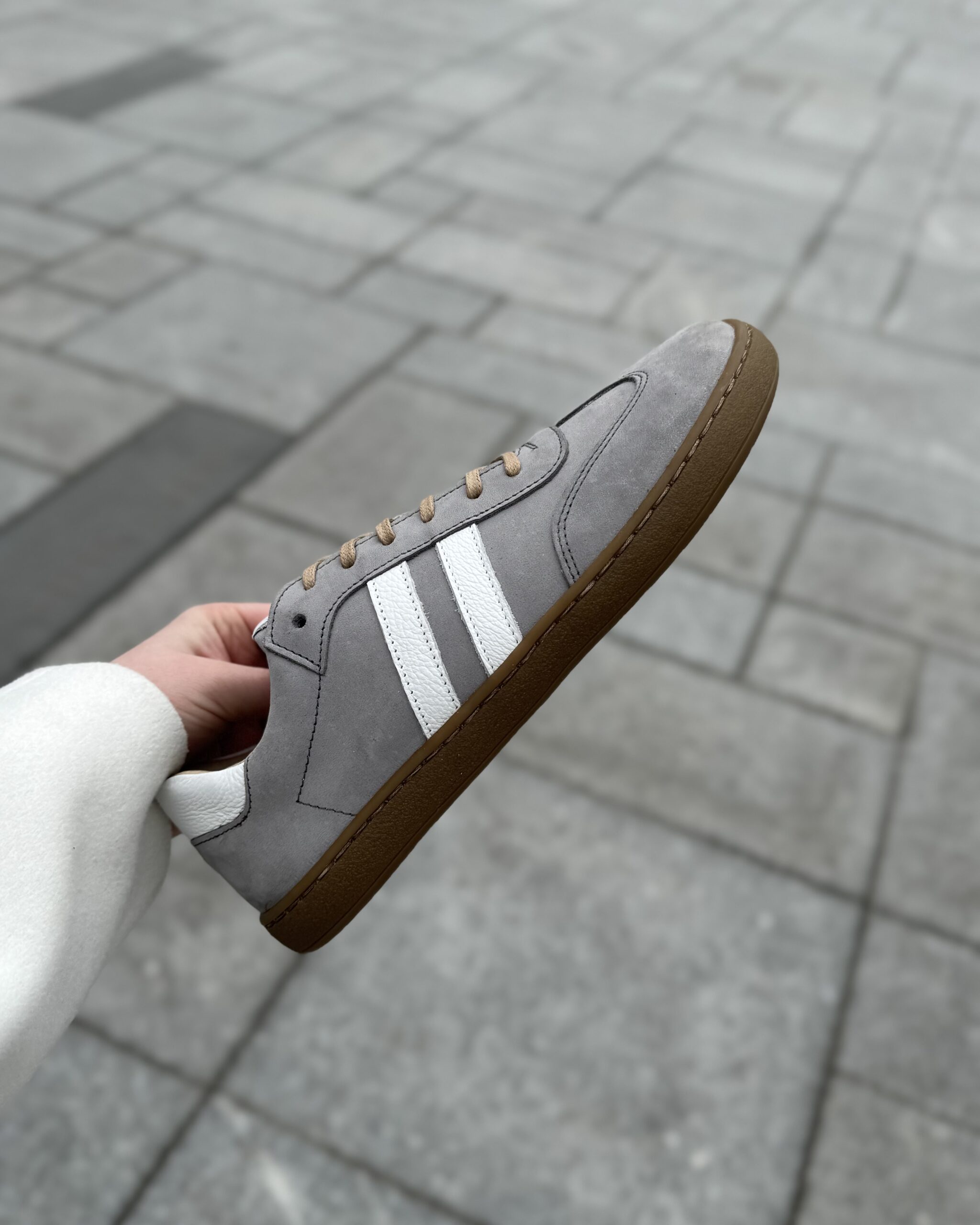 Półbuty barefoot damskie Livia w kolorze szarego nubuku to stylowe sneakersy, które łączą minimalistyczny design z wyjątkowym komfortem noszenia. Białe dodatki nadają im świeżości, a karmelowa podeszwa podkreśla naturalny, modowy charakter.