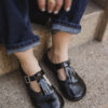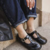 Półbuty barefoot damskie Marine – czarne lakierowane T-bar z fredzelkami