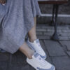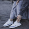 Biała baza buta nadaje im minimalistycznego charakteru, a delikatne błękitne detale wprowadzają świeżość i subtelny kolor, który przyciąga wzrok, ale pozostaje elegancki.