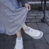 białe sneakersy z błękitnymi dodatkami wyglądają lekko, naturalnie i bardzo stylowo