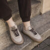 Półbuty barefoot damskie Vivi w odcieniach cappuccino to eleganckie sneakersy inspirowane naturalną paletą kolorów. Połączenie jasnej skóry licowej z welurowymi detalami oraz karmelową podeszwą tworzy harmonijny, stylowy model o minimalistycznym charakterze.