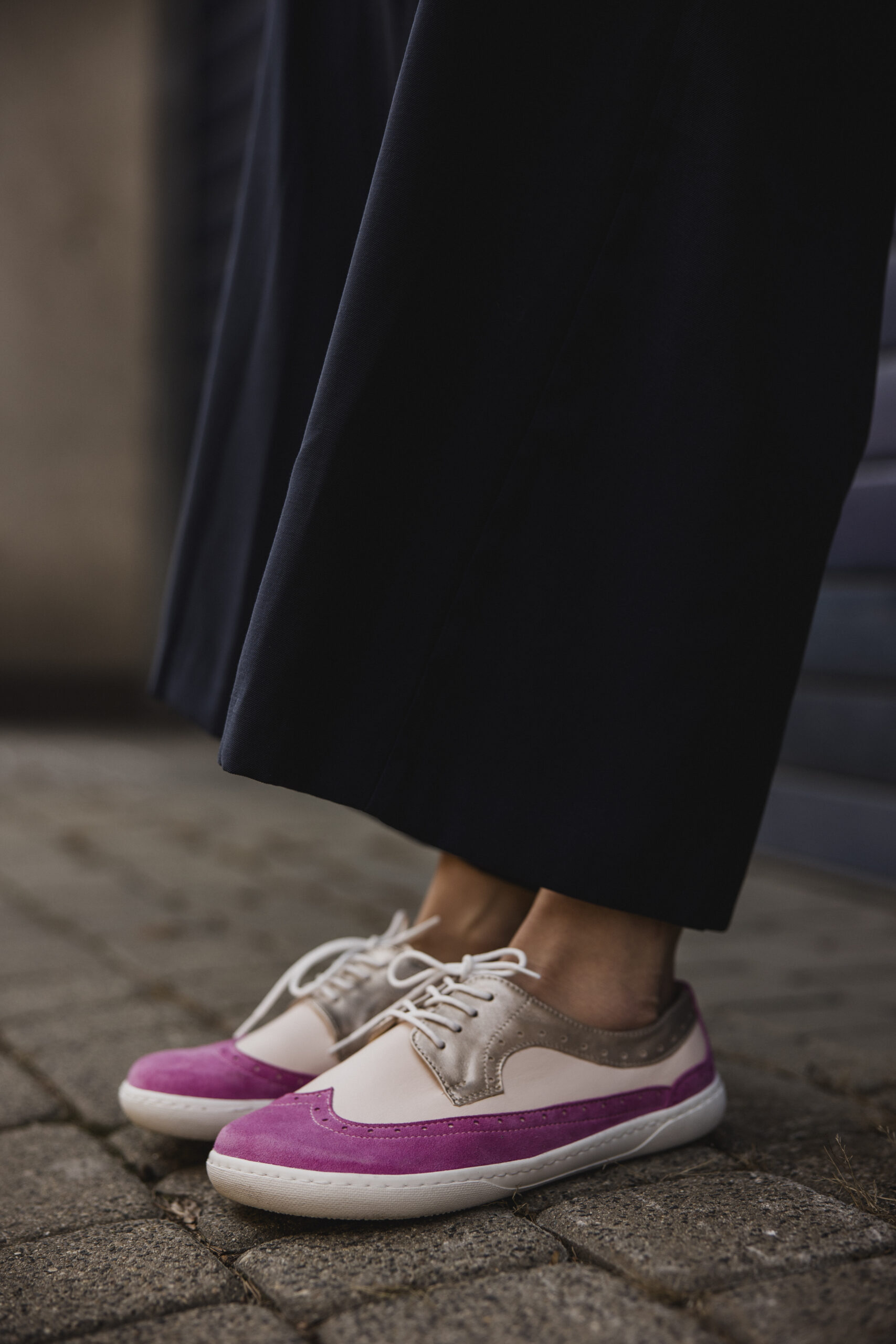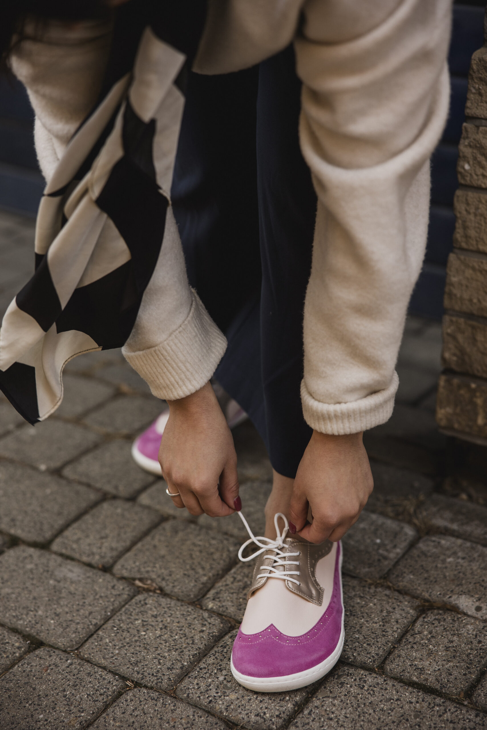 Damskie półbuty Jenny barefoot kolorze różowym i złotym na białej podeszwie obszywanej to idealna propozycja dla kobiet ceniących sobie zarówno styl, jak i komfort.