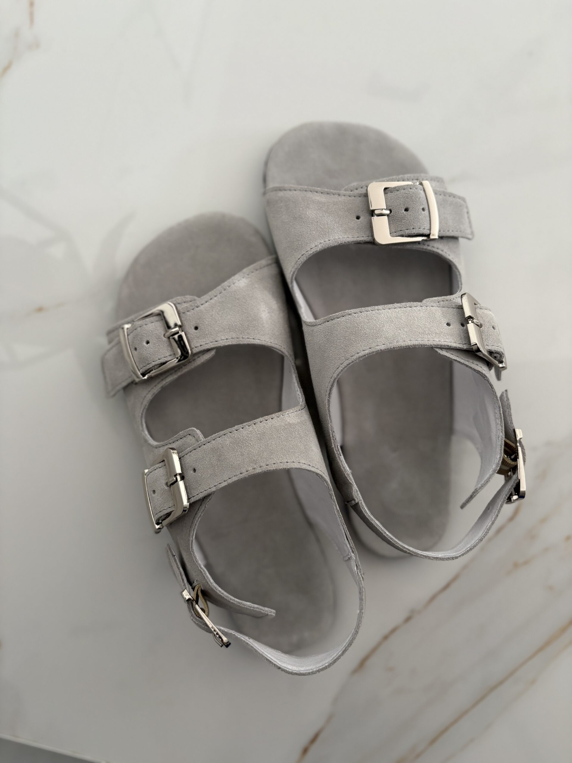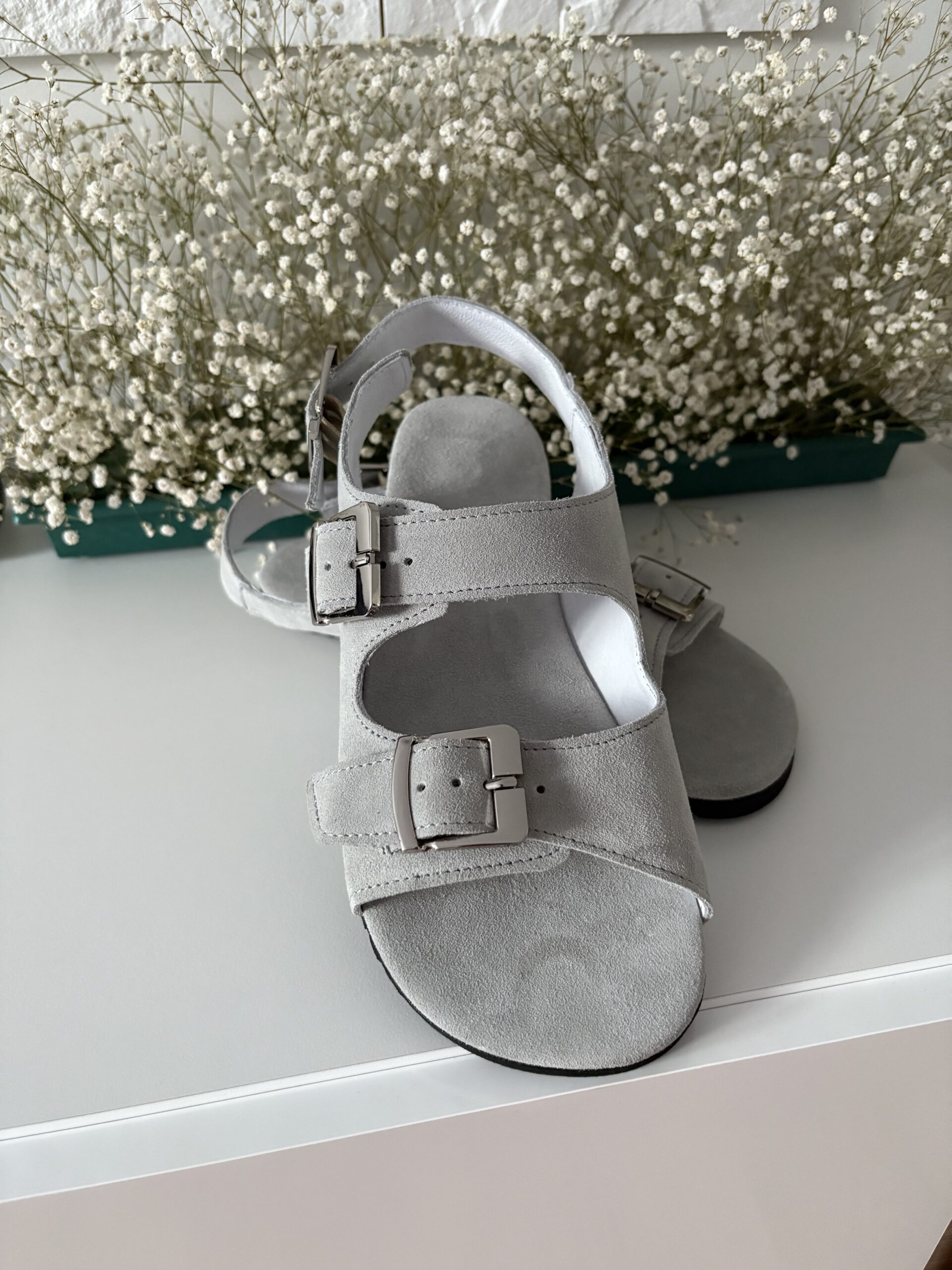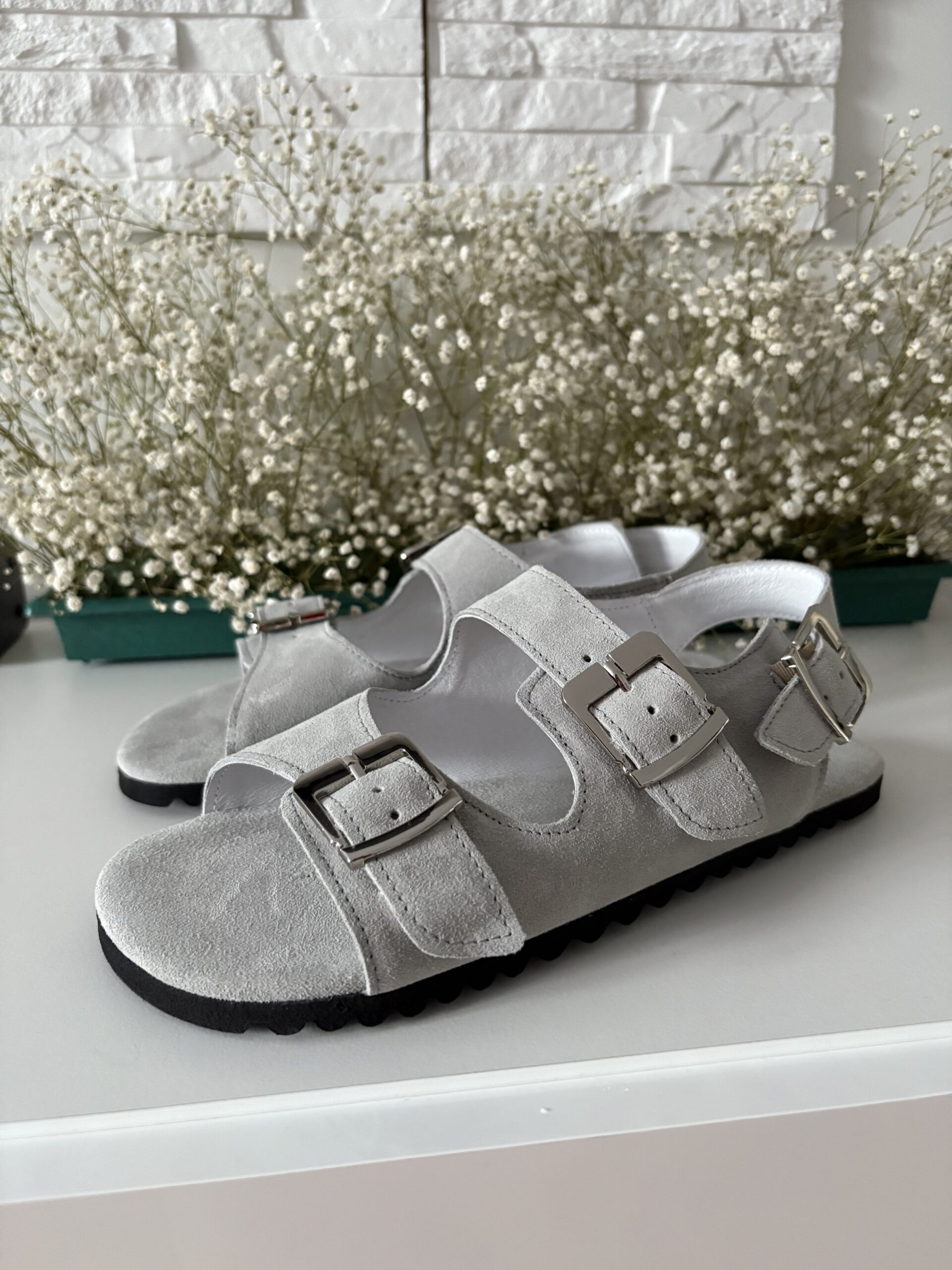 Szary welur nadaje sandałom elegancji i sprawia, że są bardzo uniwersalne.